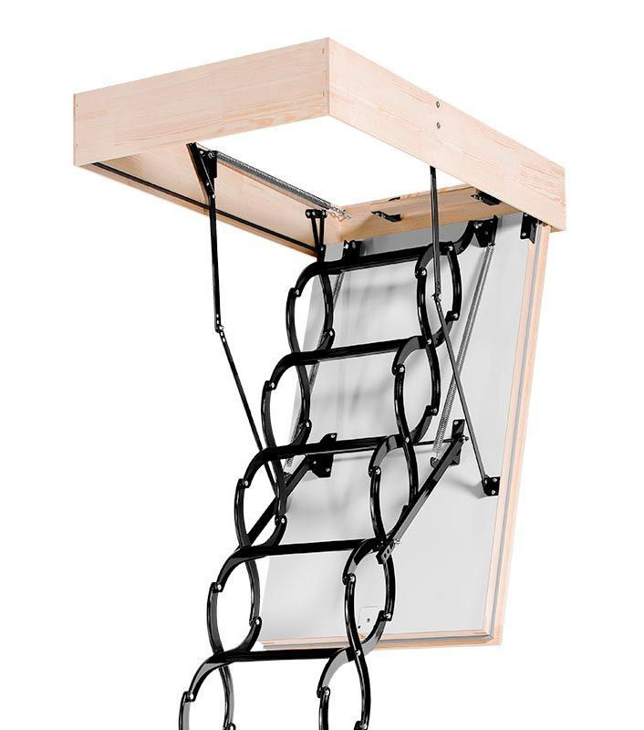Утепленная лестница-ножницы на чердак. Крышка белая с двух сторон, по технологии "сендвич" толщиной 86 мм, лестница из 10 металлических сегментов ножничного типа. Максимальная нагрузка 160 кг. По периметру крышки есть уплотнитель 2 контура, он обеспечивает герметичность.Коробка - сосна, высота короба 170 мм. Ширина лестницы 365 мм, длина ступени 345 мм, глубина 80 мм.
