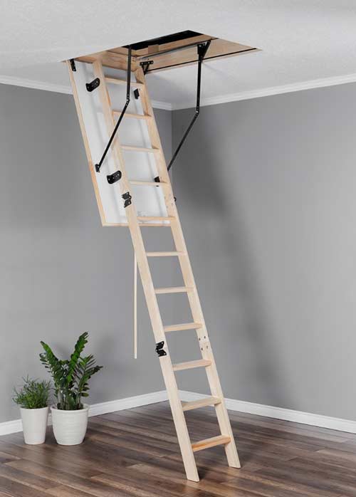Утепленная раскладная лестница на чердак. Крышка белая с двух сторон, по технологии "сендвич" толщиной 26 мм, лестница из сосны 3 секции, ступени деревянные. Максимальная нагрузка 160 кг. По периметру крышки есть уплотнитель, он обеспечивает герметичность.Коробка - сосна, высота короба 135 мм. Ширина лестницы 400 мм, длина ступени 358 мм, глубина 80 мм.