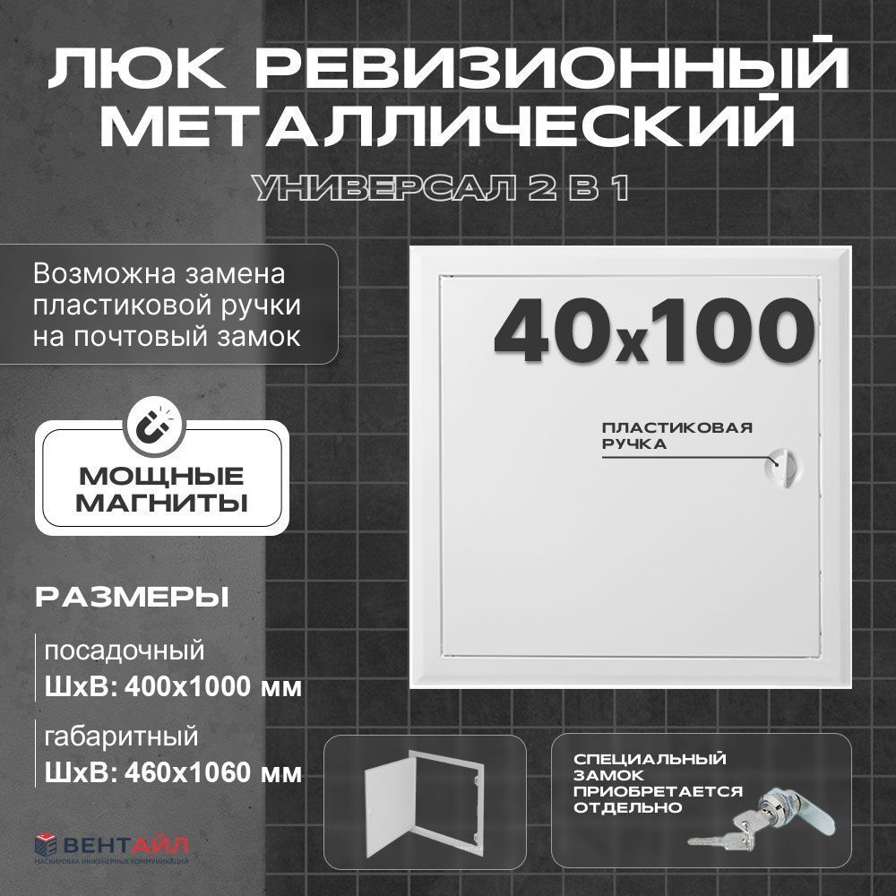 Люк металлический ревизионный с магнитом и пластиковой ручкой 40x100, модель "Универсал" 2 в 1