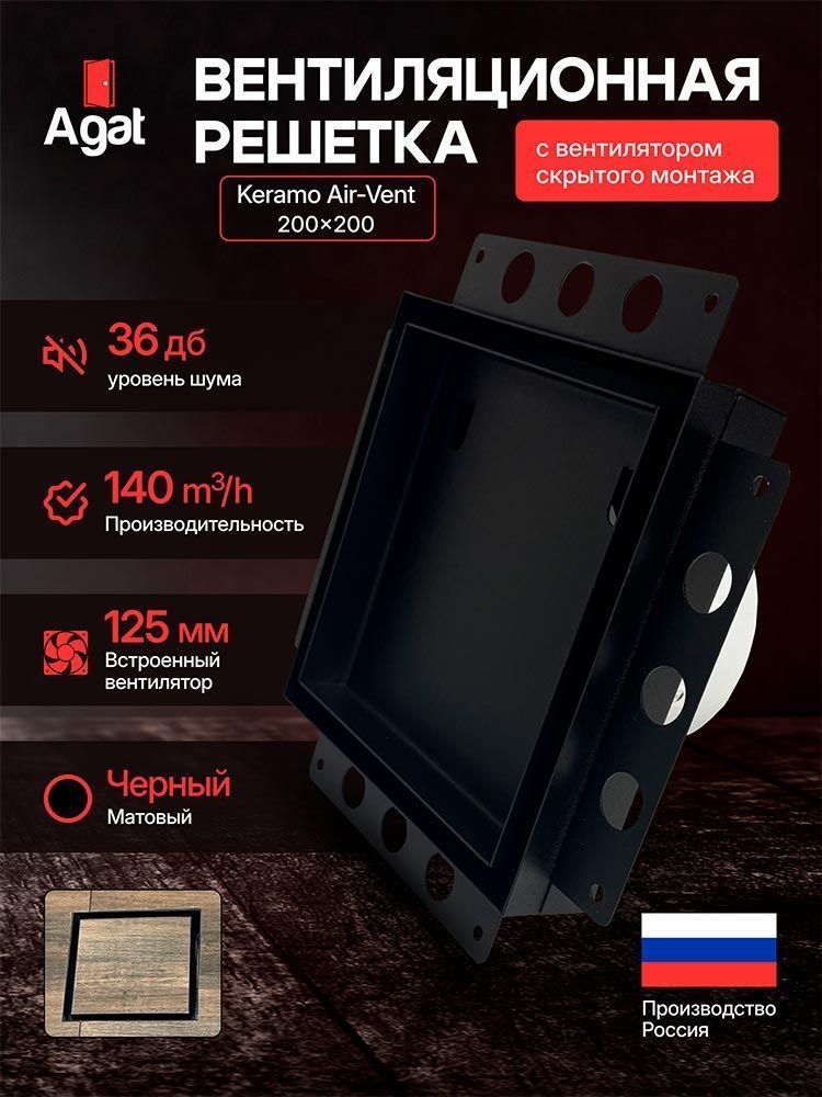 Вся конструкция с мощным вентилятором монтируется в стену до укладки плитки. После завершения работ видимой остается лишь тонкая элегантная рамка черного цвета. Вы получаете мощную вытяжку, не жертвуя эстетикой.Преимущества модели Agat Keramo Air-Vent 200х200, d 125 мм: