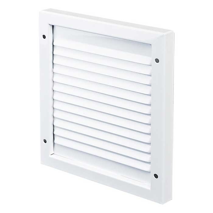 Сталь 0,8 мм, сборка при помощи точечной сварки, окраска по RALВ стандартном исполнении решетка имеет наружную раму из гнутого П-образного профиля, жалюзийную решетку помещенyую внутрь рамы и состоящую из секций одинаковой длины и ширины. Минимальный размер 21х25 см, максимальный размер 192х178 см.