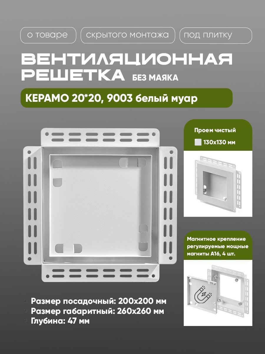 Данная модель БЕЗ МАЯКА. Белый или черный цвет на выборРешетка КЕРАМО монтируется скрытым способом и после отделки виден только аккуратный теневой зазор около 13 мм, что сохраняет безупречный вид стены. Идеальное решение для вентиляции в помещениях с отделкой декоративной штукатуркой, обоями, стенами под покраску. Изготовлена из стали, окрашена полимером в заводских условиях. Имеет мощные магниты с регулировкой по плоскости.